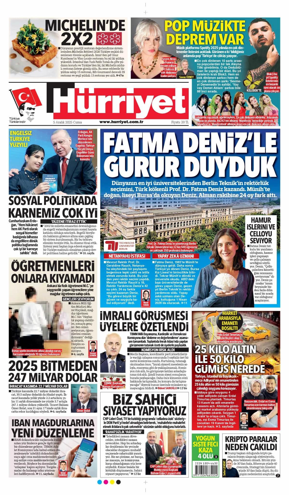Hürriyet Gazetesi 5 Aralık 2025 Günü Manşeti